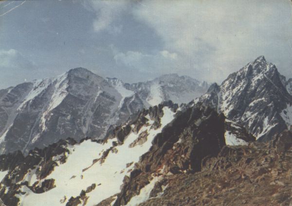 TATRANSKÝ NÁRODNÝ PARK - Pohľad z Lomnického sedla (2193 m) na juhozápad. Vľavo Slavkovský štít (2453 m),uprostred Gerlachovský štít (2655 m), vpravo Prostredný hrot (2440 m)
