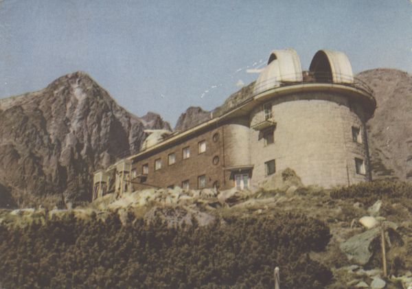 Obserwatorium Astronomiczne SAN nad Łomnickim Stawem. W tle Łomnica. Tytuł również w języku: ros., ang., niem.