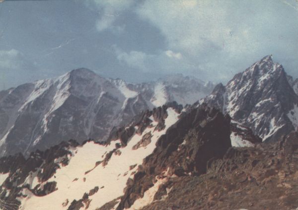 VYSOKÉ TATRY - Pohľad z Lomnického hrebeňa na juhozápad. Vľavo Slavkovský štít (2453 m), uprostred Gerlachovský štít (2655 m), vpravo Prostredný hrot (2440 m)