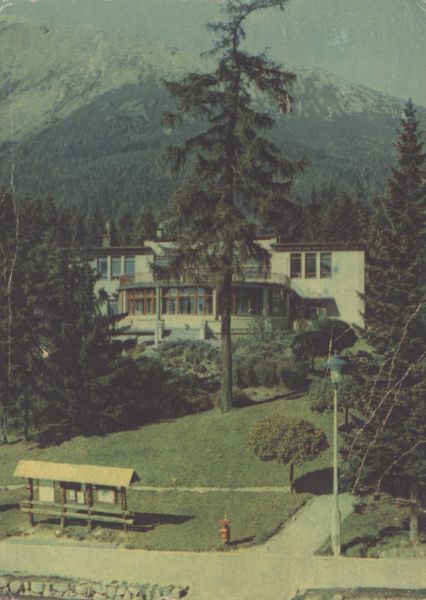 Widok na Grand Hotel - Restaurację i bar Taverna w Starym Smokowcu. Na pierwszym planie park. W głębi las i stok Sławkowskiego Szczytu.