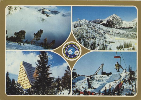 Pocztówka 4. elementowa: Szczyrbskie Jezioro w zimowej scenerii. Areał snów, w tle Krywań, Ostra i Solisko. Hotel Panorama. Kolej linowa krzesełkowa na skocznie narciarskie. Pomiędzy zdjęciami logo miasta VYSOKÉ TATRY.