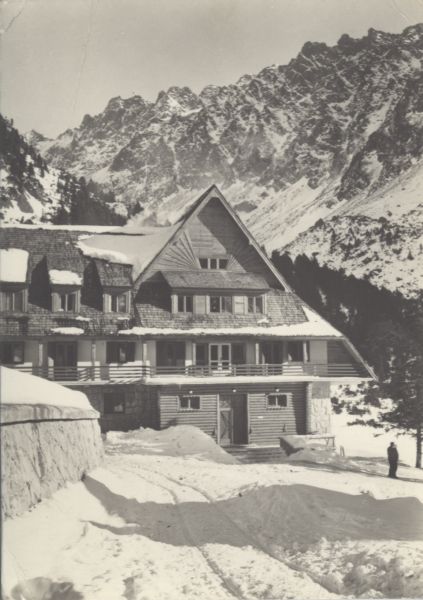 Widok na hotel górski im. kpt. ©tefana Morávki przy Popradzkim Stawie w scenerii zimowej. Przed hotelem stoj± 2 osoby.
