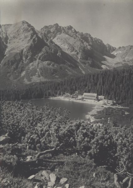 Widok na Popradzki Staw. Na pierwszym planie kosodrzewina (Pinus mugo Turra). W głębi hotel górski kpt. Štefana Morávki otoczony lasem. W tle Pośrednia Baszta oraz Szatan.