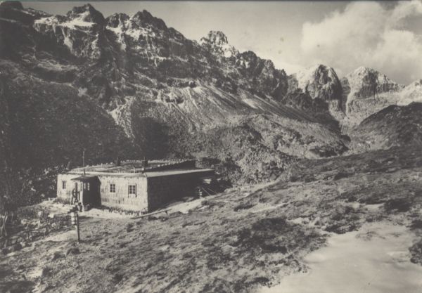 VYSOKÉ TATRY Veľká Studená dolina Zbojnícka chata (1960 m), v pozadí zľava hrebeň Skrinicových vežy, Bradavica (2476 m), Kupola (2414 m), Východná Vysoká (2428 m) a sedlo Prielom (2288 m)