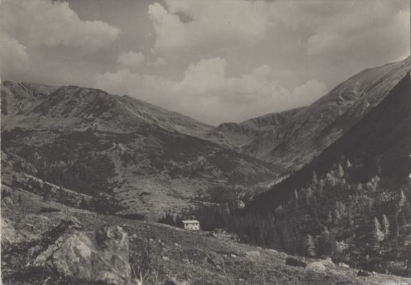 Widok na schronisko Żarskie w dolinie Żarskiej. W tle Żarska Przełęcz.
