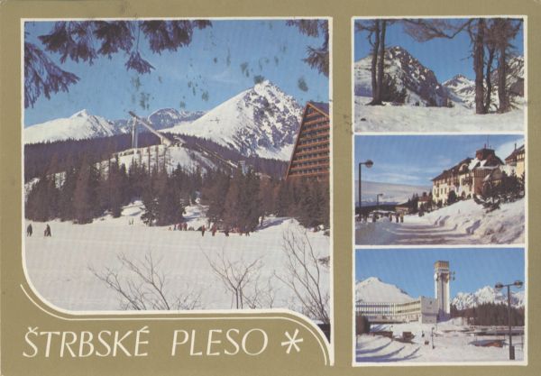 Pocztówka 4. elementowa. Na kolejnych zdjęciach przedstawiono: Zimowy widok na Szczyrbskie Jezioro z hotelem Patria i Krywaniem, Ostr± i Szczyrbskim Soliskiem w tle