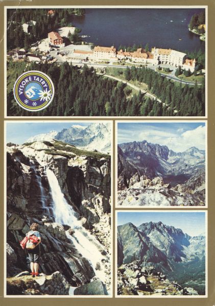 Pocztówka 4. elementowa: Widok na zabudowania hotelowe w Szczyrbskim Jeziorze. Wodospad Skok w Dolinie Młynickiej. Widok z Osterwy na Grań Baszt, Koprową Przełęcz, Koprowy Wierch. Mała Baszta, Pośrednia Baszta. U góry logo miasta VYSOKÉ TATRY.