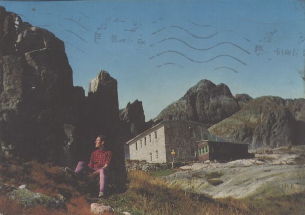 Schronisko Téryego w Dolinie Pięciu Stawów Spiskich. Na pierwszym planie turysta. W tle szczyty. Nad schroniskiem charakterystyczna Spąga, przełęcz Czerwona Ławka i Mały Lodowy Szczyt.