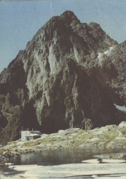 Schronisko Téryego w w Dolinie Małej Zimnej Wody. Na pierwszym planie Pośredni Staw Spiski. W tle Pośrednia Grań i Żółty Szczyt.