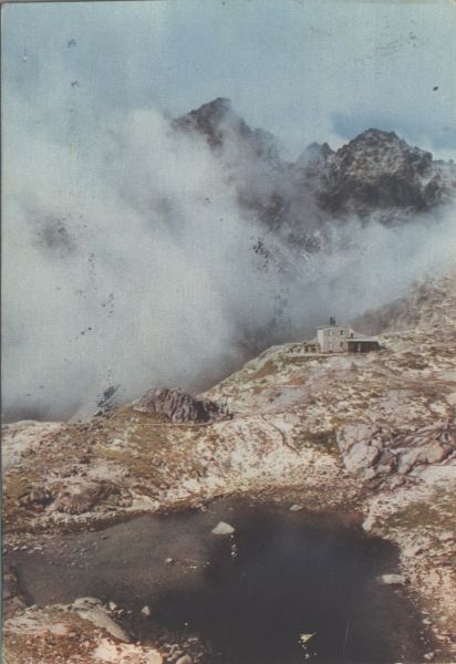 Tatrzański Park Narodowy [Słowacja] - Dolina Małej Zimnej Wody, schronisko Téryego. Z przodu Mały Staw Spiski. Tytuł również w języku: ros., niem.,