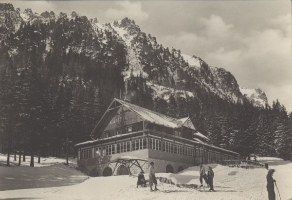 Zimowy widok na schronisko pod Kozicą u podnóża Sławkowskiego Szczytu w Dolinie Zimnej Wody. Na pierwszym planie narciarze.