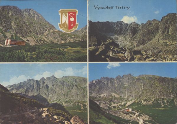 VYSOKÉ TATRY - VYSOKIE TATRY - HOHE TATRA - THE HIGH TATRAS Horský hotel Sliezsky dom (1670 m) vo Velickej doline - Pohľad na masív Gerlachovského štítu (2655 m) - Pohľad z magistrály do Velickej doliny, nad ňou Bradavica (2476 m), Rohatá veža a Dvojitá veža (2311 m)