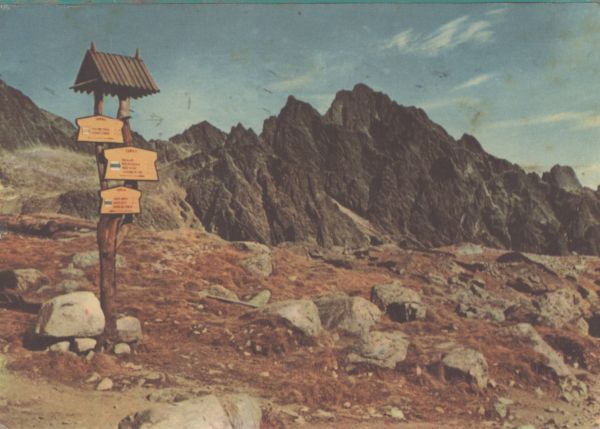 Widok z Doliny Staroleśnej na Pośrednią Grań i Żółty Szczyt. Na pierwszym planie szlak i kierunkowskaz turystyczny.