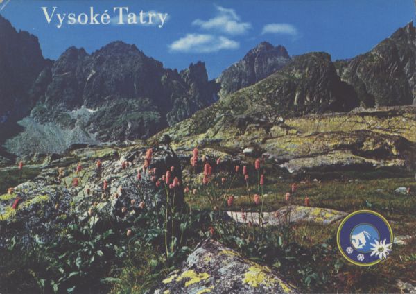 Widok ze Schroniska Téryego na Drobną Turnię, Sokolą Turnię, Spągę, Czerwoną Ławkę, Mały Lodowy Szczyt, Pięciostawiańską Kopę (z przodu). Na pierwszym planie kwitnący rdest wężownik (Polygonum bistorta L.). W lewym rogu u góry napis: Vysoké Tatry. W prawym rogu u dołu logo miasta: VYSOKÉ TATRY.