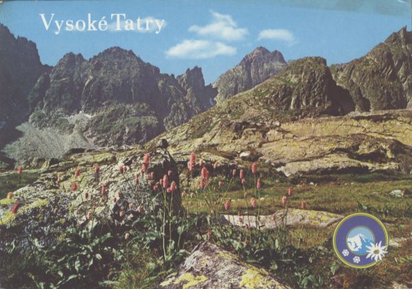 Widok ze Schroniska Téryego na Drobną Turnię, Sokolą Turnię, Spągę, Czerwoną Ławkę, Mały Lodowy Szczyt, Pięciostawiańską Kopę (z przodu). Na pierwszym planie kwitnący rdest wężownik (Polygonum bistorta L.). W lewym rogu u góry napis: Vysoké Tatry. W prawym rogu u dołu logo miasta: VYSOKÉ TATRY.