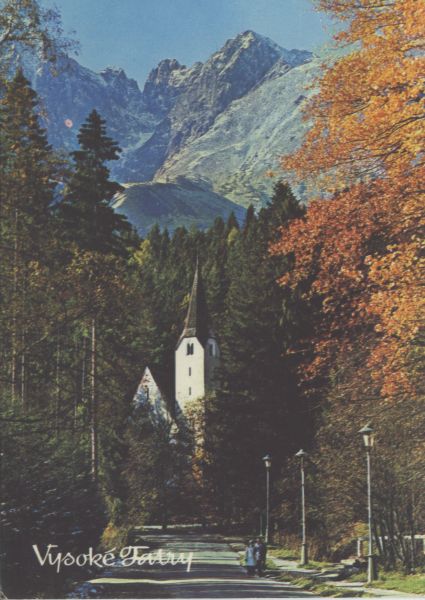 Widok z drogi w Tatrzańskiej Łomnicy na Zachodni Szczyt Wideł, Przełęcz w Widłach, Wielki Szczyt Wideł i Kieżmarski Szczyt. Na pierwszym planie droga, po której idą 2 osoby. W głębi kościół ewangelicki. Na dole po lewej stronie napis: Vysoké Tatry.