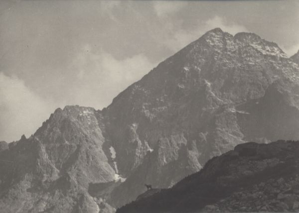 Widok z Doliny Jagnięcej na północną ścianę Małego Kieżmarskiego Szczytu. Na pierwszym planie na skale kozica (Rupicapra rupicapra). W tle od lewej strony: Kieżmarska Kopa, Mały Kieżmarski Szczyt i Kieżmarski Szczyt.
