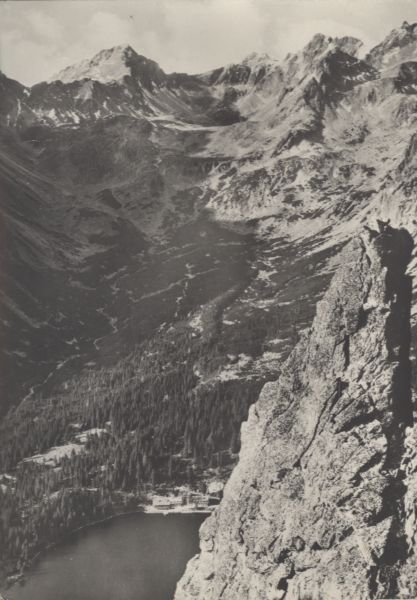 Igła w Osterwie. W dole schronisko nad Popradzkim Stawem. W tle Dolina Mięguszowiecka ze szczytami: Koprowy Wierch, Cubryna, Mięguszowiecki Szczyt.
