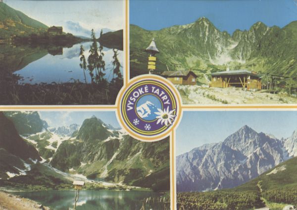Pocztówka 4. elementowa. Na kolejnych zdjęciach przedstawiono: Widok na schronisko im. Alberta Brnčala przy Zielonym Stawie Kieżmarskim