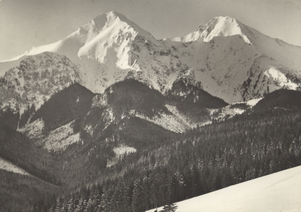 Widok na Tatry Bielskie: Hawrań i Płaczliw± Skałê w scenerii zimowej. Na pierwszym planie las.