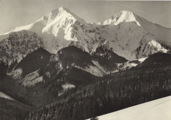 Widok na Tatry Bielskie: Hawrań i Płaczliwą Skałę w scenerii zimowej. Na pierwszym planie las.