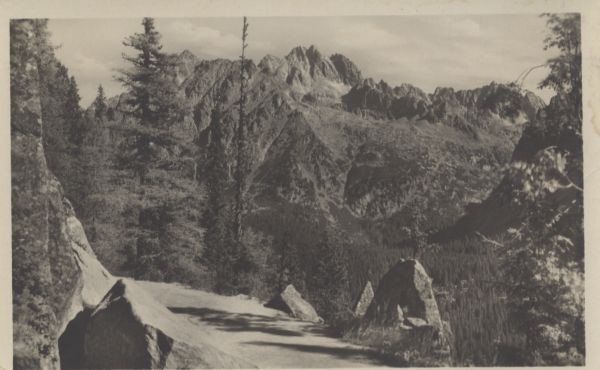 Pocztówka użyta w obiegu pocztowym, znaczek oderwany, korespondencja. Logotyp wydawcy. Dodatkowo pieczęć: P.P. Chata u Popradského Plesa 1513 m n. m.