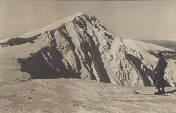 Zimowy widok na Dziumbier. Na pierwszym planie narciarz.