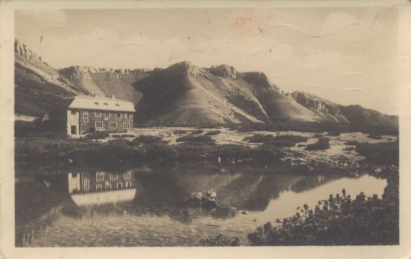Widok na schronisko Kieżmarskie, odbijające się w tafli Wielkiego Białego Stawu w Dolinie Białych Stawów. Na pierwszym planie Wielki Biały Staw, wokół niego zarośla kosodrzewiny (Pinus mugo Turra). W tle szczyty Tatr Bielskich, od lewej: Jatki, Golica Bielska, Bujaczy Wierch, Rakuski Grzbiet.