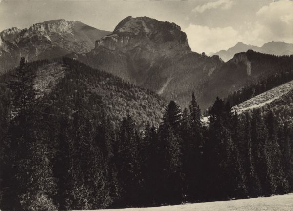 Widok z Jaworzyny na Murań i Nowy Wierch w Tatrach Bielskich. Na pierwszym planie las.