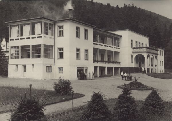 Widok na sanatorium w Tatrzańskiej Kotlinie i jego otoczenie. Przed budynkiem kuracjusze.