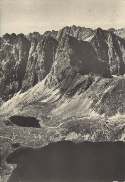 Widok z Mięguszowieckiej Przełęczy pod Chłopkiem na Wielki i Mały Hińczowy Staw. W tle od lewej Zadnia Baszta, Mała i Wielka Capia Turnia, Hlińska Turnia i Szczyrbski Szczyt.