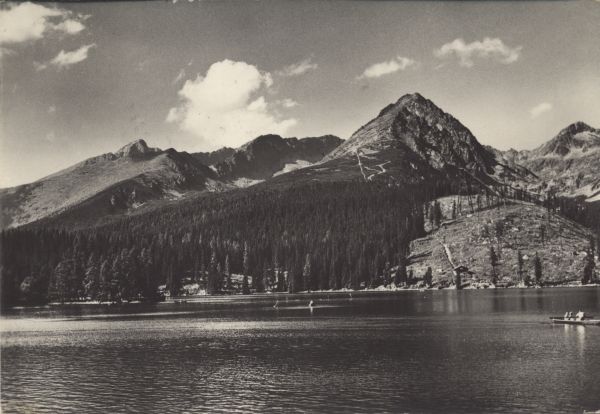 Widok na Szczyrbskie Jezioro i pływaj±ce po nim łódki. W tle od lewej strony szczyty: Krywań, Ostra, Wielkie Solisko i Szczyrbski Szczyt. Pod Skrajnym Soliskiem widoczna skocznia narciarska.