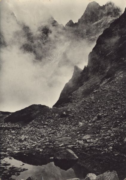 Widok znad Czerwonego Stawu Kieżmarskiego. W tle z chmur wyłania się Poślednia Turnia, Durny Szczyt i Mały Durny Szczyt nad Doliną Kieżmarską.