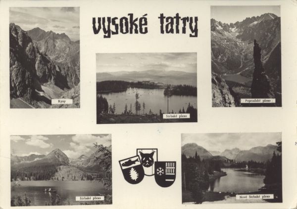 Widok na Nowe Szczyrbskie Jezioro, w tle Wysoka. W górnej części pocztówki napis: vysoké tatry, a w dolnej herby 3 miejscowości.