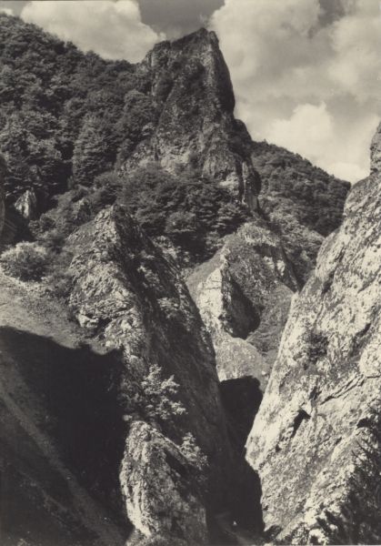 Widok na Strażowskie Wierchy w Maninskim wąwozie. Na pierwszym planie w wąwozie widoczny turysta.
