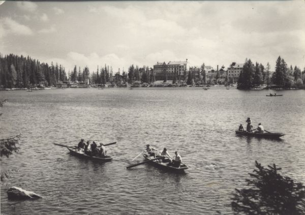 Widok na Szczyrbskie Jezioro, po którym pływają łodzie. W dali na brzegu jeziora las i budynki sanatoryjne Hviezdoslav i Krywań.