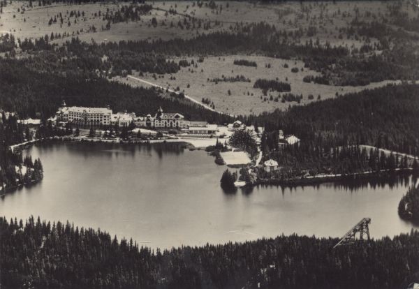 Widok na Szczyrbskie Jezioro. Na brzegu zabudowania sanatoryjno hotelowe. Po prawej stronie na dole widoczna skocznia narciarska.