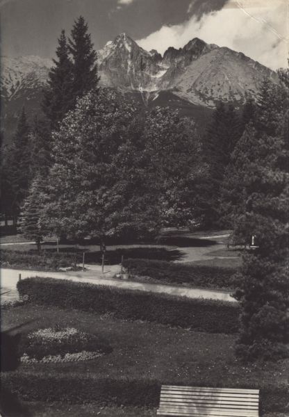 VYSOKÉ TATRY - Tatranská Lomnica Park, v pozadí Lomnickę (2634 m) a KeŸmarskę čtít (2556 m)