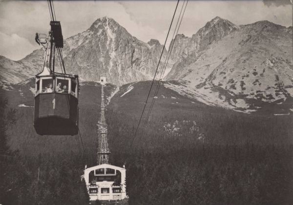 TATRANSKĘ NÁRODNĘ PARK Lanovka na Skalnaté pleso (1752 m). Nad ním Lomnickę čtít (2634 m) a KeŸmarskę čtít (2556 m).