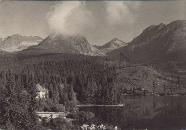 Widok na Szczyrbskie Jezioro i jego otoczenie. W tle szczyty, od lewej: Ostra, Szczyrbskie Solisko, Szczyrbski Szczyt i grań Baszt ze Skrajn± Baszt±. Pod Szczyrbskim Szczytem widoczna skocznia narciarska.