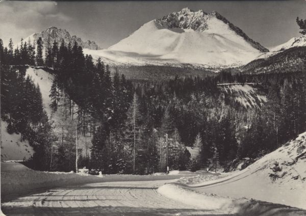 Widok na Kończystą i Gerlach w zimowej scenerii z Tatrzańskiej Polanki. Na pierwszym planie Droga Wolności, w głębi las.