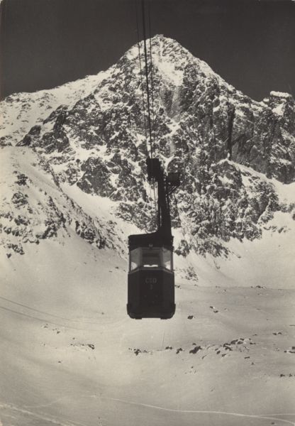 Wagonik kolei linowej nad Doliną Łomnicką zimą. W tle Łomnica.
