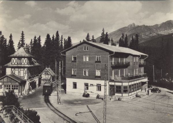 Widok na budynek sanatorium dla dzieci w Szczyrbskim Jeziorze Solisko i jego otoczenie. Przed budynkiem na ławkach siedz± ludzie. Z lewej strony widoczna stacja Tatrzańskiej Kolei Elektrycznej, obok niej wagonik kolei. W tle Krywań i Ostra.