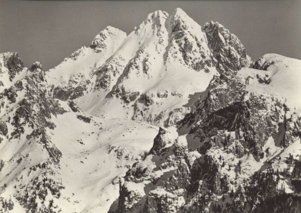 Tatry Wysokie. Ciężki Szczyt (w lewo), dwuwierzchołkowa Wysoka i Smoczy Szczyt nad Dolink± Smocz± W prawo urwiska Osterwy.