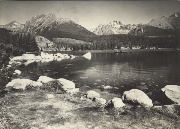 Widok na Szczyrbskie Jezioro. Na stawie tury¶ci pływaj±cy w łódce. Na pierwszym planie brzeg stawu z granitowymi głazami. W tle szczyty, od lewej: Szczyrbski Szczyt, Grań Baszt ze Skrajn± Baszt±, Kopa Popradzka, Wysoka, Tępa i Kończysta.
