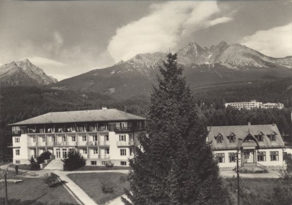 VYSOKÉ TATRY - Tatranská Lomnica (900 m) Zotavovòa ROH Volga. V pozadí Slavkovskę (2453 m), Lomnickę (2634 m) a KeŸmarskę čtít (2556 m)