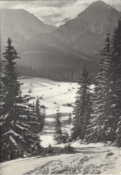 Zimowy widok z Doliny M±kowej na Szerok± Przełęcz i Płaczliw± Skałę w Tatrach Bielskich. Na pierwszym planie ¶wierki (Picea A. Dietr.), w głębi las.