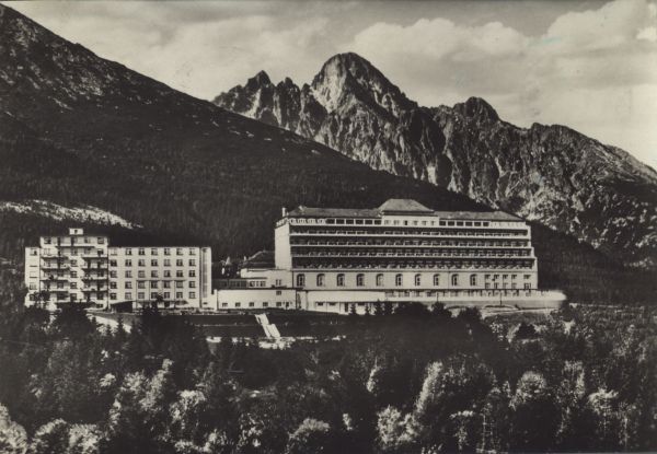 Budynek sanatorium w Nowym Smokowcu i jego otoczenie. Na pierwszym planie las, w tle grupa Łomnicy.