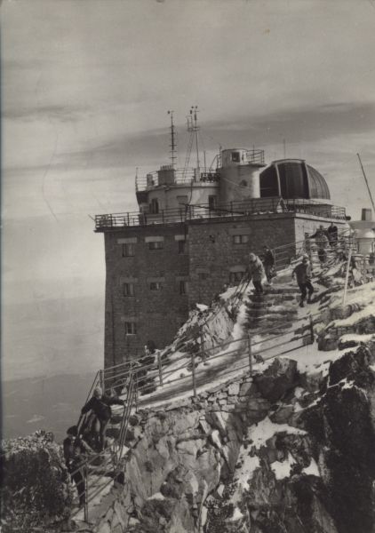 Widok na budynek stacji kolei linowej na wierzchołku Łomnicy i stację meteorologiczną. Na pierwszym planie taras widokowy, na którym znajdują się turyści.