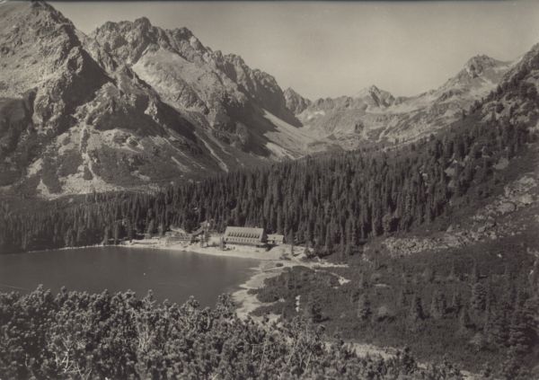 Widok na Popradzki Staw. Na pierwszym planie kosodrzewina (Pinus mugo Turra). W centralnej czę¶ci hotel górski kpt. ©tefana Morávki otoczony lasem. W tle szczyty: na lewo Szatan, na wprost Koprowy Wierch, na prawo Wołowiec Mięguszowiecki.